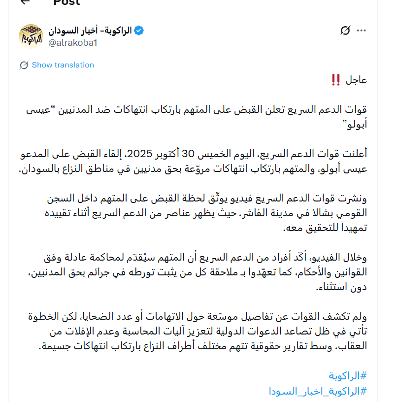 |  Re: الدعم السريع يعتقل ابولولو.. (Re: حيدر حسن ميرغني) |  |