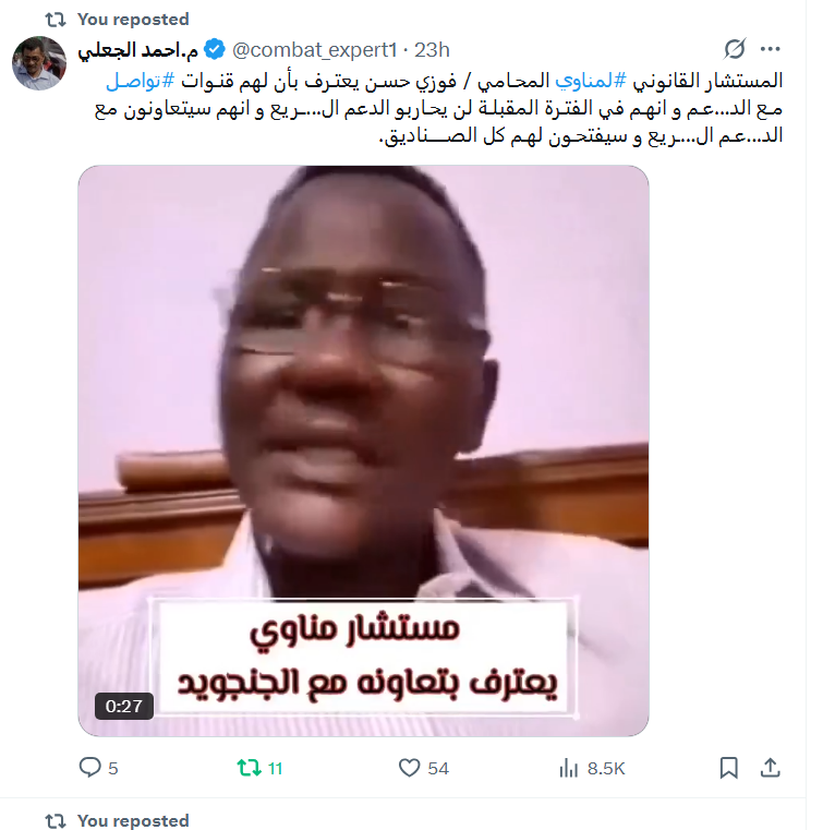 كدا كتير علي البلابصة والبلبوصيات داخل وخارج المنبر الحر يا اشوس😊يلقوها من الجيش الجلس مع الدعم السريع ولا من مستشار مناوي القانوني فوزي حسن القال بانه اتواصل مع الجنجويد امبارح وواضح لهم بانهم سوف يفتحون لهم الصناديق في اي حرب قادمة وسوف يسلمهم كل الاحداثيات المهمة ولا الصراعات العنيفة داخل اجنحة بورتسودان ولا من شنو ولا شنو!!