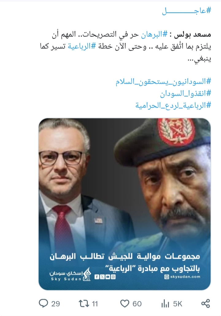 وأضاف أن مخرجات الآلية الرباعية الدولية تسير وفق الخطة الموضوعة، وأن فريق الوساطة يتابع عن كثب تطورات الوضع بهدف الوصول إلى سلام شامل وإنهاء الحرب عبر اتفاق مدعوم بضمانات إقليمية ودولية، دون الكشف عن تفاصيل إضافية حول البنود أو الجدول الزمني للتنفيذ.