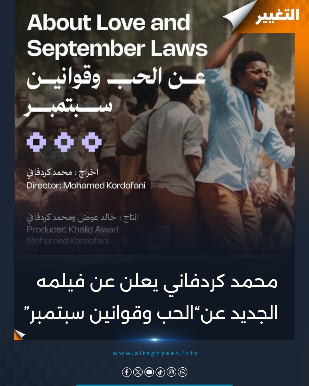 مخرج السوداني محمد كردفاني يعلن عن انطلاق مشروعه السينمائي الجديد بعنوان “عن الحب وقوانين سبتمبر”، وهو فيلم درامي رومانسي تدور أحداثه في سياق سياسي وتاريخي مستلهم من التحولات الكبرى التي شهدها السودان في مطلع ثمانينات القرن الماضي، بين تطبيق قوانين الشريعة الإسلامية واندلاع ثورة أبريل 1985.