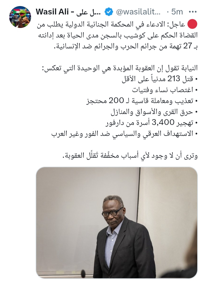حكم المحكمة يعتبر إدانة للجيش الذي كان يعمل فيه المحرك علي كوشيب.