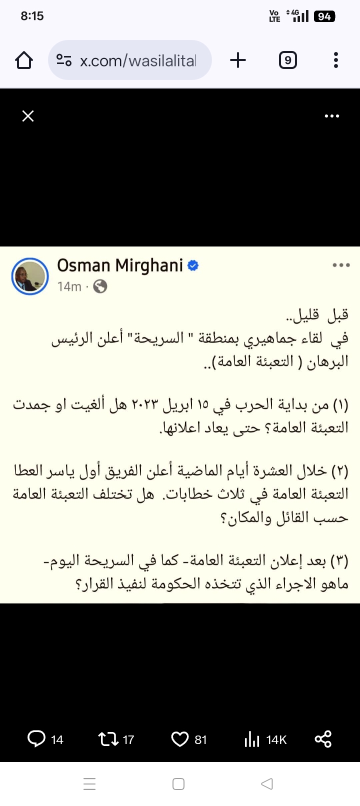 اعلن التعبئة العامة ، وهي غير " الاستنفار " . وتجهيز جميع السودانيين وحمل السلاح ، والتوجه غربا، لدحر " مرتزقة الجنجويد " الذين جلبهم " خونه " تاسيس الاوغاد ، بتوجيه من " دويلة الشر " اللمارات ،" التي سياتي دورها لاحقا " . وذلك بسبب النقص الحاد في صفوف الجنجويد ، وقادتهم الماهريه ، والرزيقات ، " علي وجه الخصوص " الذين تم " قبرهم " ولقوا حتفهم في السنوات الماضية من عمر الحرب ..
