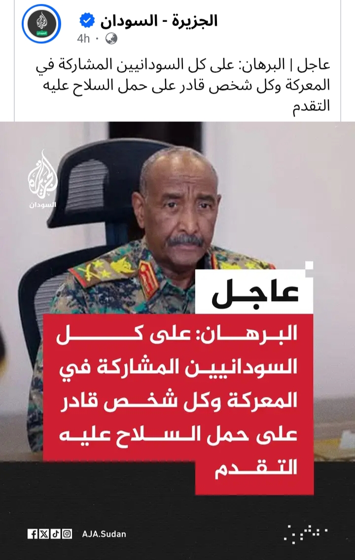 يقول ليك امجاد وجيشه يستنفر في شعبه بدل يكون هو من يحميه المواطن دافع الضرائب يستقطع من ماله لصالح الدولة والجيش يستحوذ على ٨٠٪ من ميزانية البلاد ما قادر يبني نفسه جنرالات الجيش عملوا شركات خاصة وعقارات وارصدة ما ليها حد في البنوك وعقارات في الخارج وبعد ده كله عاوزين المواطن يدافع عن سلطتهم لا عن البلد. واول ما تؤول لهم امور الحكم وقت السلم يكون المواطن نفسه اول ضحاياهم اذا بس عبر عن رأيه بالتظاهر السلمي او باي شكل من اشكال التعبير الحر. هذا تاريخنا منذ الاستقلال ... لا غلاط في ذلك