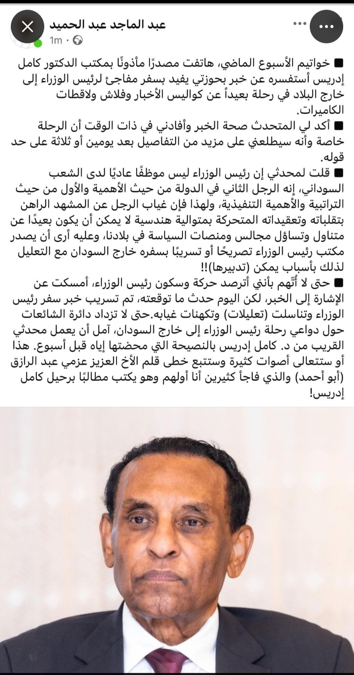 ترددت أنباء عن وجوده بسويسرا مستشفياً.. غياب رئيس الوزراء كامل إدريس عن المشهد يثير التكهنات. #سودانية24 | #بلد_في_شاشة وأخرون يقولون انه غاضب من البرهان لانه ليس عضوا في لجنة التفاوض مع صمود