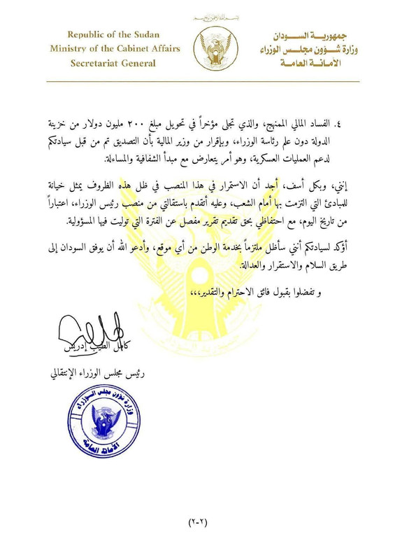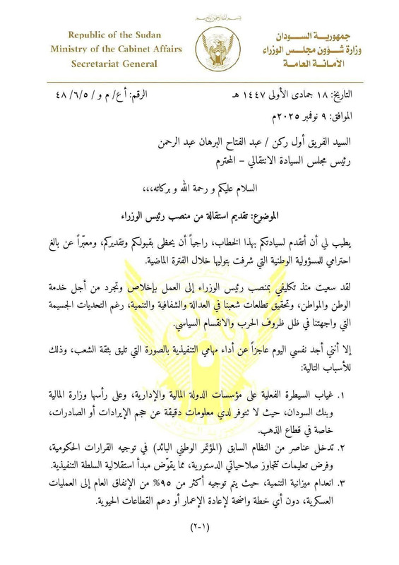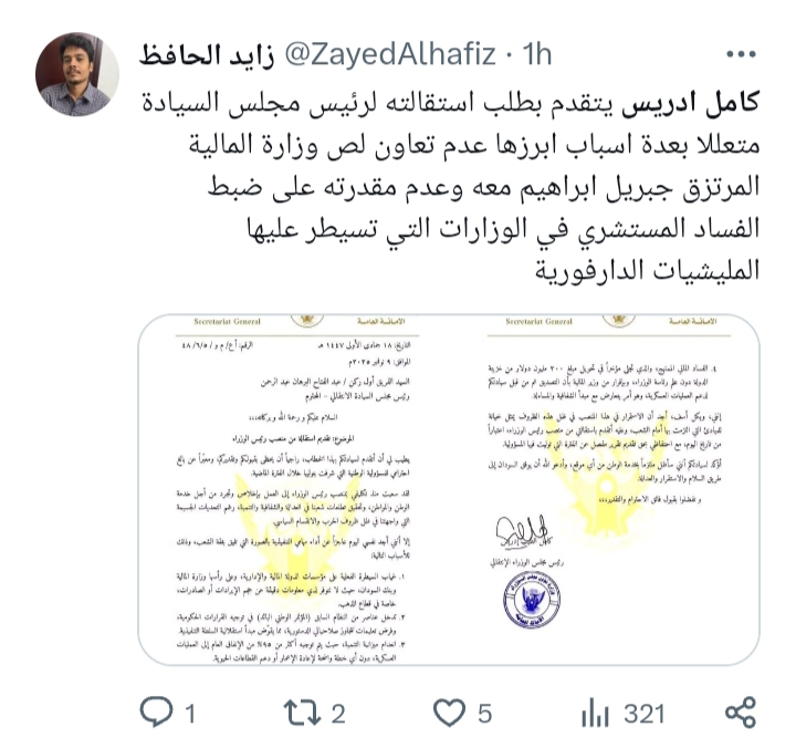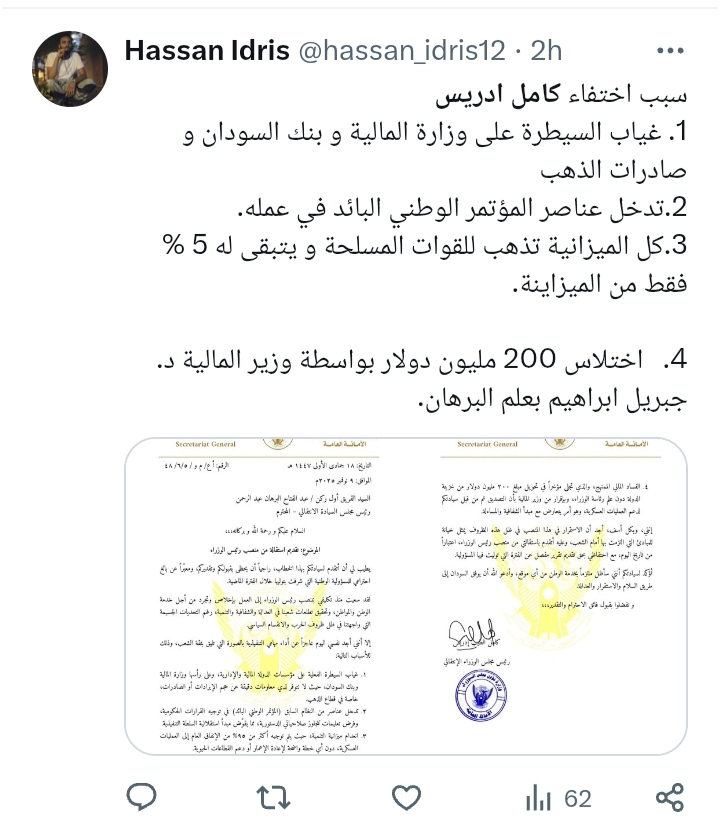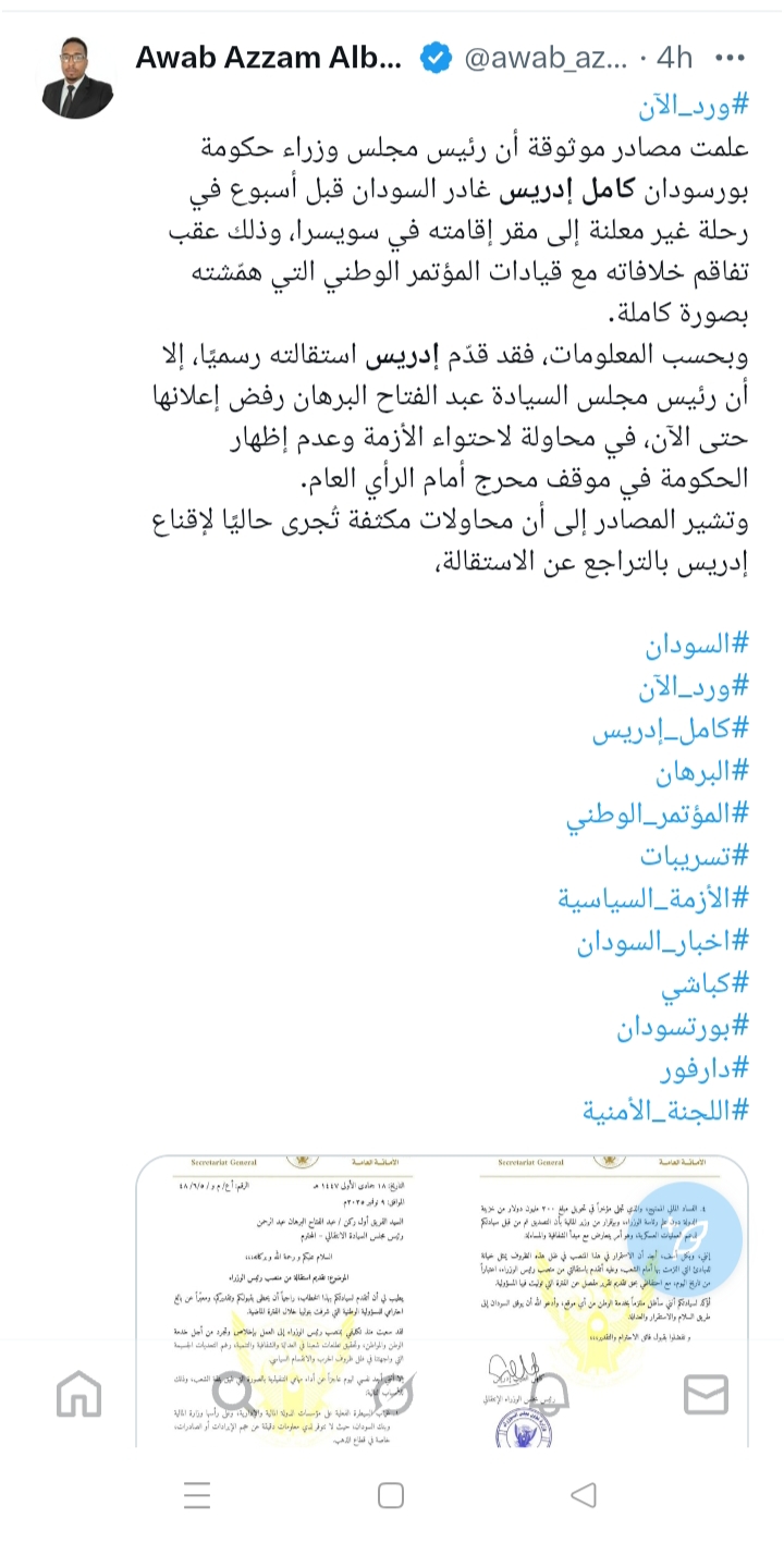 والمصادر تقول بان البرهان رفض استقالة الرجل لان الوقت غير مناسب والبرهان ما عندو رئيس وزراء جاهز والاهم من ذلك استقالة كميل ادريس ستدل علي ان سلطة برهان كسيحة وعاجزة وهي بالفعل كذلك