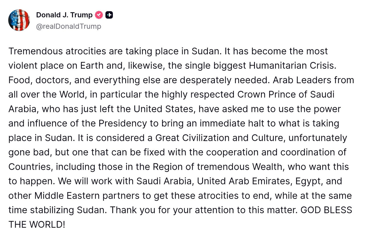 ورغم أن الرئيس الأمريكي أعلن عن استعداده للاهتمام بحل النزاع في السودان، فإنه حدد الدافع بشكلٍ فاضح وهو رغبة أصدقاء أمريكا في المنطقة، وليست خممة إنسانية او حتى خدمة لمصلحة أمريكية مباشرة أو إستراتيجية واضحة.