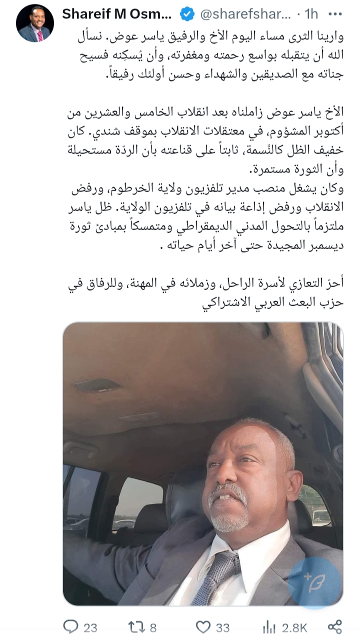 ببالغ الحزن والأسى، نودّع اليوم المخرج والكاتب الجميل، الإنسان الذي كان يحمل لساناً يضحك ووجهاً يبشّر بالحياة… وداعاً ياسر عوض، رفيق سنوات العمل الشاق، ورفيق أحلامنا التي صنعتها كاميرات صغيرة وقلوب كبيرة. عرفناه هادئاً، لطيفاً، صادقاً في حضوره… لا يرفع صوته حتى في أصعب لحظات البث، ولا يكسر بخاطر زميل مهما اشتد الزحام أو ضاق الوقت. كان ياسر مدرسة في المهنية، وإنساناً في المقام الأول… يبتسم قبل أن يتكلم، ويُطمئن قبل أن يوجّه. وفي سنوات الثورة، حين فُتحت أبواب الحلم، كان ياسر في مقدمة الصف، مديراً لفضائية الخرطوم بروح ثائرة وضمير يقظ… يقود الشاشة بوعي ومسؤولية، ويضع همّ الوطن قبل كل مشهد ومادة وبثّ مباشر. كان يعرف أن الإعلام موقف… وأن الكلمة قد تصبح أحياناً قدر. رحيلك يا ياسر ليس غياباً عادياً… هو انطفاء مصباح ظلّ مضيئاً في غرفة مملوءة بالتعب. هو فراغ في الممرات… وفي قلوب زملائك… وفي ذاكرة قناة كاملة عرفتك أخاً ورفيقاً ومعلماً دون أن تتكلف أو تتصنّع. نعزّي أنفسنا قبل أن نعزّي أسرتك الكريمة… ونعزّي كل من عرفك وعمل معك ودخل قلبه دفؤك وطيبتك.