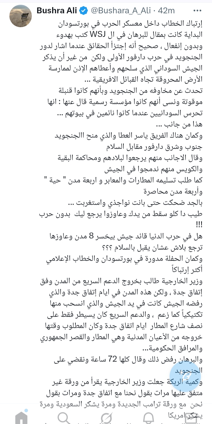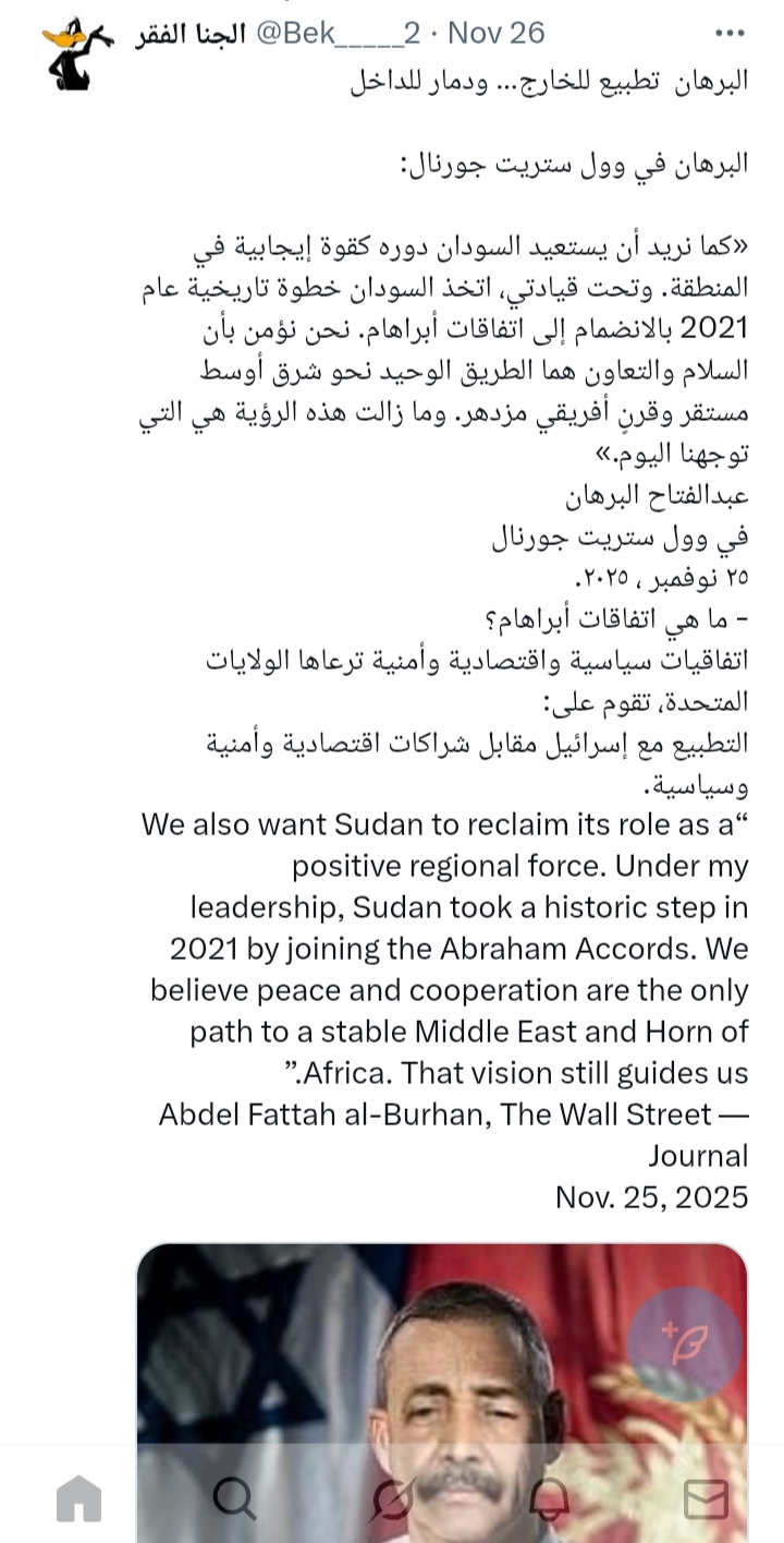 الجريدة هذا الصباح.. من ميدان الحرب استخدم البرهان الدبلوماسية الناعمة على صفحات الصحف، فردّت الخارجية الأمريكية بأسلوب حاد هدّدته فيه باستخدام السلاح الكيماوي، وهذا ما يعني أن مقال البرهان ذهب إلى سلة المهملات قبل أن يجفّ حبره!! أطياف صباح محمد الحسن رد الرسالة!! طيف أول: للذين كتبنا ميلاد غيظهم بثورة لاميراث لكم على أرضها ستحفر اسم الوطن من جديد وتعيد الأمر إلى نصابه وتقصم ظهر أحلامكم يدًا بيد وعندما تُغلق نوافذ الحوار ، وتنقطع حبال الوصل التي كانت تربطك بالآخر، وقبل ذلك تفقد القبول لدييه ويتلاشى احترامك لأنك لم تعد موضع ثقة في كلمة أو عهد أو وعد، فإن أول ما يفعله الطرف المقابل هو حرمانك من فرصة الإصغاء إليك من جديد، وسدّ أبوابه دونك، ليمارس عليك سياسة التهميش بالصمت وعدم الاستماع، الأمر الذي يشعرك بأن إلغاء وجودك أصبح ممكنًا. وهنا، أول ما يتبادر إلى ذهنك أن تلجأ إلى كتابة رسالة خطية، آخر مراحل العجز في فقدان التواصل ، لأنك تظن أن من لا يسمعك ولا يمنحك فرصة ثانية قد يقرأ رسالتك ويفهمك. ولهذا جاءت رسالة البرهان التي نشرها في صحيفة وول ستريت جورنال بعنوان: "حقيقة الحرب في السودان"؛ رسالة كتبها بعدما فقد الأمل في التواصل المباشر مع المجتمع الدولي، فكانت بمثابة نعي للدبلوماسية في عهده، وتشييعها إلى مثواها الأخير . رسالة كشفت عجز الدور السياسي لحكومة بورتسودان، ورسّخت صورة الجنرال الذي غدا ضعيفًا حدّ التوسل، يخاطب عواطفهم بدلًا من عقولهم، فجاءت أشبه برسالة منتحر فقد الأمل نهائيًا في المستقبل، ولم يبقَ بينه وبين النهاية سوى لحظات معدودة. أفرغ البرهان في تلك الرسالة تناقضاته وكذبه، ثم جلس على ركبتي حرفه يتوسل أميركا بأنه صاحب اتفاقيات إبراهام، في حالة استجداء سلبت هيبة المؤسسة العسكرية بقوله: "ونريد أيضًا أن يستعيد السودان دوره كقوة إقليمية إيجابية. فقد اتخذ السودان في عام 2021 خطوة تاريخية بانضمامه إلى الاتفاقات الإبراهيمية." وولماذا يكتب البرهان لأمريكا او غيرها ألم يقل إن المجتمع الدولي لايعنيه!! وتنصّل الجنرال من مسؤوليته عن تعديل المادة (5) التي شرعنت قوات الدعم السريع وضمتها إلى القوات المسلحة، بقوله: "ولذلك سعت الحكومة السودانية في ديسمبر 2022 إلى اتّباع مسار يهدف إلى دمج قوات الدعم السريع في الجيش السوداني بصورة مسؤولة. كان هدفنا منع نشوب الصراع، وحفظ التماسك الوطني، وتوحيد جميع التشكيلات المسلحة تحت قيادة قانونية واحدة. لم تكن نيتنا المواجهة بل الإصلاح." ومعلوم أن تعديل المادة (5) لم يكن قرارًا حكوميًا، بل قرارًا عسكريًا خالصًا صاغه البرهان بيده، باعتباره بندًا عسكريًا لا يحق لأحد تعديله سوى قائد الجيش نفسه. فهو من زرع بذرة الدعم السريع في جسد القوات المسلحة، لذلك قال إنها خرجت من رحمها!! ولكن يبدو أن الحكومة الأمريكية تعاملت مع مقال البرهان بذات الأسلوب (أنت اكتب لي وأنا أكتب ليك) فبعد نشر المقال ب 24ساعة كتبت الخارجية الأمريكية، مكتب شؤون أفريقيا، مغرّدة: "وكأنها ترد الرسالة" على حكومة السودان أن تعترف فورًا بانتهاكاتها، وأن توقف أي استخدام إضافي للأسلحة الكيميائية، وأن تتعاون بشكل كامل مع منظمة حظر الأسلحة الكيميائية (OPCW) لمعالجة هذه الانتهاكات." مما يعني أن ما خطّته الخارجية يتضمن إدانة سياسية وقانونية شديدة، ويعكس تصعيدًا دبلوماسيًا ذا أبعاد دولية خطيرة. ويدعو حكومة السودان إلى الاعتراف بانتهاكاتها المتعلقة باستخدام الأسلحة الكيميائية، والتعاون مع منظمة حظر الأسلحة الكيميائية. ففي السياق السياسي والدبلوماسي، التصريح أتى في إطار تصعيد أميركي ضد الحكومة السودانية. وبما أن الولايات المتحدة اتهمت الجيش السوداني باستخدام أسلحة كيميائية عام 2024، وهو ما اعتبرته انتهاكًا لمعاهدة حظر الأسلحة الكيميائية التي انضم إليها السودان عام 1999، فالتصريح موجّه للرأي العام الدولي بطلب الضغط على السودان عبر الإدانة العلنية، وهذا ما يعني تمهيدًا لعقوبات أو إجر