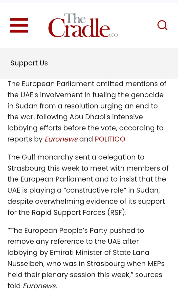 حذف البرلمان الأوروبي الإشارة إلى تورط دولة الإمارات العربية المتحدة في تأجيج الإبادة الجماعية في السودان من قرار يدعو إلى إنهاء الحرب، وذلك بعد جهود الضغط المكثفة التي بذلتها أبو ظبي قبل التصويت، بحسب تقارير يورونيوز وبوليتيكو .