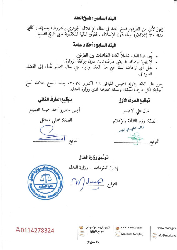 تعيش السودان واحدة من أكثر المراحل التباسًا في تاريخها الحديث، مرحلة تحاول فيها حكومة بورتسودان – الخاضعة لنفوذ الحركة الإسلامية – إعادة تلميع صورتها أمام الرأي العام المحلي والدولي، رغم الانتهاكات التي ترتكبها يوميًا بحق المدنيين. وفي هذا السياق، تسربت وثيقة "عقد" من داخل وزارة الثقافة والإعلام السودانية تكشف حجم العبث المالي الذي تمارسه الحكومة؛ إذ يحصل صحافيان، أحدهما أنيس منصور، على ما يصل إلى 120 ألف دولار راتب شهري، إضافة إلى 200 ألف دولار نثريات وتشغيل.