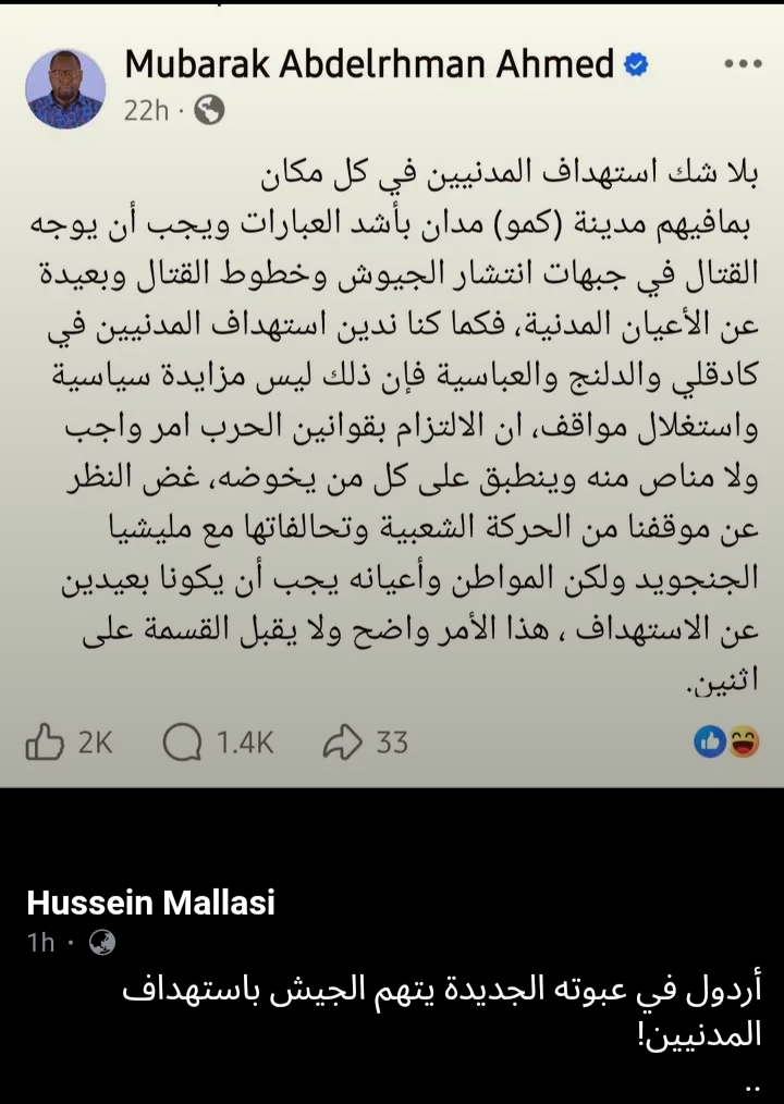 فى الأسبوع الماضى هزمت الحركة الشعبية والدعم السريع، الجيش والدواعش فى منطقة هبيلا، شرق مدينة الدلنج، ثم هزيمة الجيش فى منطقة كُرتالا شرق هبيلا. قتال بين جيوش يحولونه لأنتقام من الشعب الأعزل.