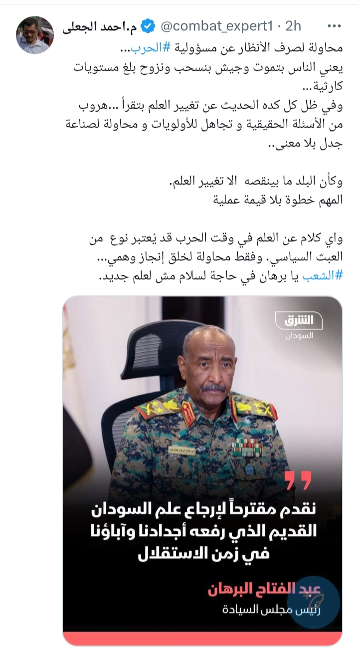 انت بتنفخ في قربة مقدودةو يا أخ حيدرـ بالنسبة للكيزان والجنجويد والحركات المسلحة، المواطن السوداني ما بيساوي نتلة، على المدنيين أن يصحوا من غفوتهم والمطالبة بإزاحة كليهما ومعهم الحركات المسلحة وجماعة الموز من أي تمثيل دستوري وياريت نزع اسلحتهم في كل المنابر العالمية والجهات المؤثرة ، لقد ضقنا ذرعا من حملة السلاح البقوا متحكمين في مصير شعب كامل طمعا في السلطة، كفاية إنو المدنيين قعدوا في كراسي المتفرجين ، لعنة الله على البرهان ومعاهو الكيزان على حميدتي ومن شايعة والحركات المسلحة اللي كانوا السبب في كل ما نحن فيه الآن.