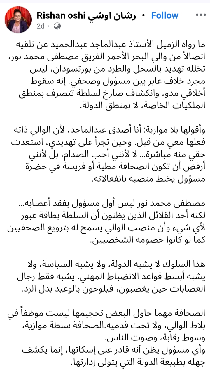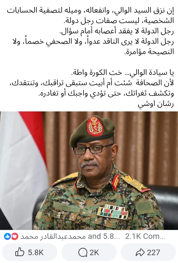 اخي حيدر تحياتي عبد الماجد في مجالس الصحفيين انتقد الوالي واعتبره صاحب ليالي حمراء وما فاضي للولاية وكمان فاسد من هنا بدا الصراع وبعدين عبد الماجد كوز معتق كان وزير اعلام ايام البشير في النيل الابيض المهم هو من جناح احمد هلرون الان والعسكر خالص تجبروا