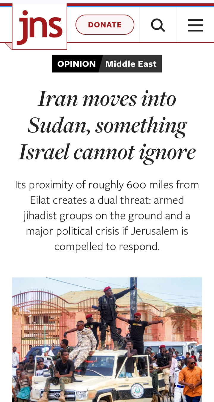 طالع التقرير ده قال شنو : التهديد الأساسي لإسرائيل لم يعد الجيوش التقليدية أو الأنظمة العربية المعادية. الخطر الحقيقي يأتي من الدول الفاشلة التي تسيطر عليها الميليشيات الإسلاموية، والتي يعتمد شرعيتها على مهاجمة إسرائيل والعمل كوكلاء لإيران. https://www.jns.org/iran-moves-into-sudan-something-israel-cannot-ignore/