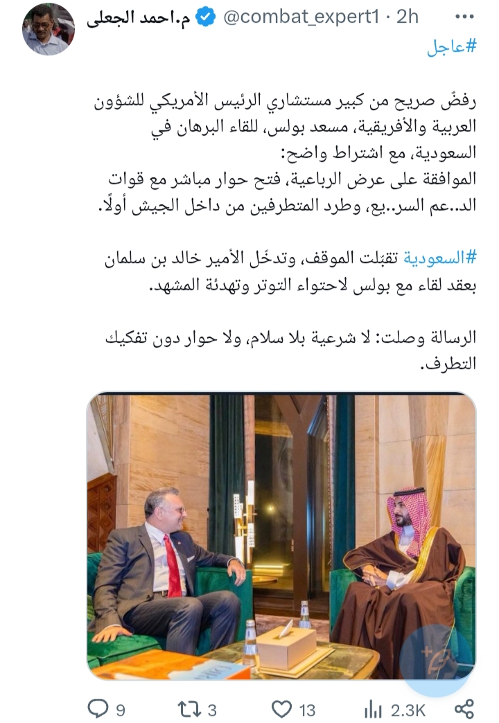 خلاصة ما وصلت اليه المفاوضات السعودية السودانية هي -------------- السعودية لا تسعى بالضرورة "لمنح شرعية"، بل لإعادة ضبط مسار التواصل مع الجيش لانتزاع مفاتيح إدارة الأزمة، ربما عبر منح ضمانات أو فتح مسار وساطة جديد يختلف عن مسار جدة السابق وهذا كان طلب رسمي سوداني سابق .