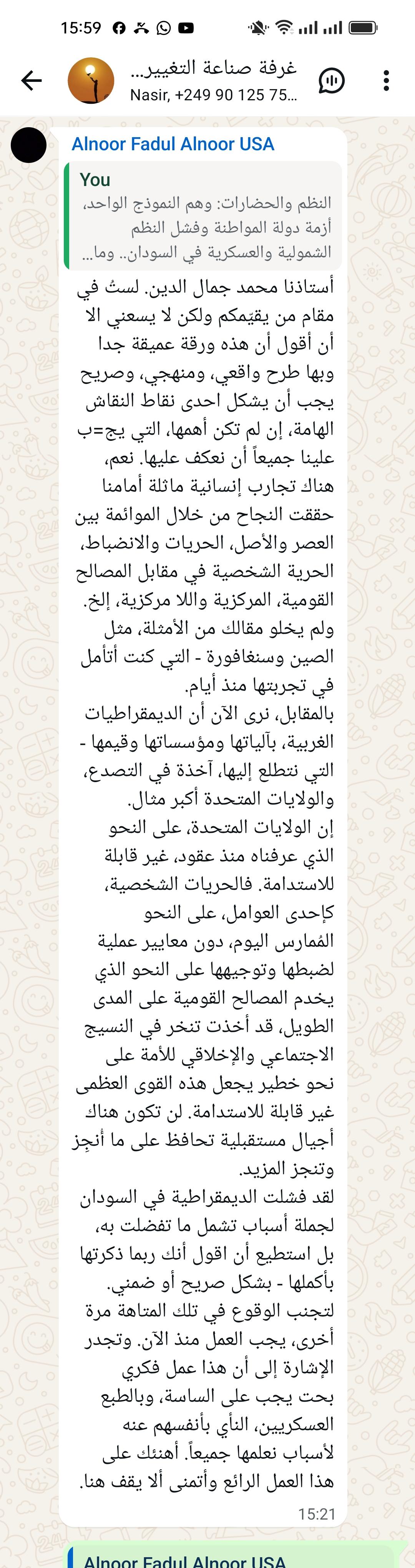 شاكر يا ول أبا محمد جمال لمجهودك الكبير والثر فى تفكيك الأزمة السودانية ..