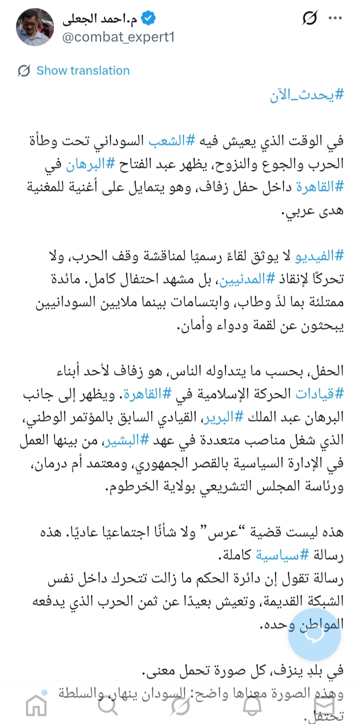 سلام حيدروف اظن انا شفت الفديو دا زمان قبل الحرب في السودان. البيت دا في السودان من شكله وشكل المنازل ولا يشبه القاهرة. القونة هدى عربي من بعيد شكلها صغير ولسه ما عجزت وبتغني في اغنية قديمة (حبيبي بستناك في الكبري محل بطير القمري) وبعدين حركة العروس يجوا شايلنها العبيد فدي موضة قديمة لا اظن تتماشى مع اعراس القاهرة. المصريين لا يمكن ان يتساهلوا في امن الرؤساء الذين يزوروهم ويتركوا البرهان يلبس زي العربجي ويحوم في الاعراس دون حماية امنية مصرية.