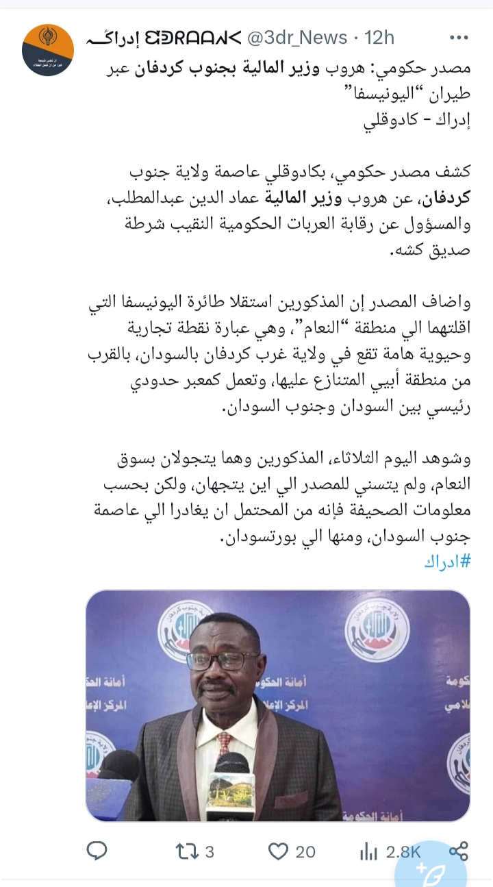 هروب وزير المالية بجنوب كردفان بطيران يونسيفا