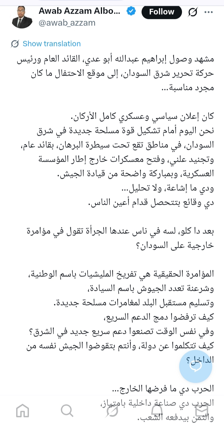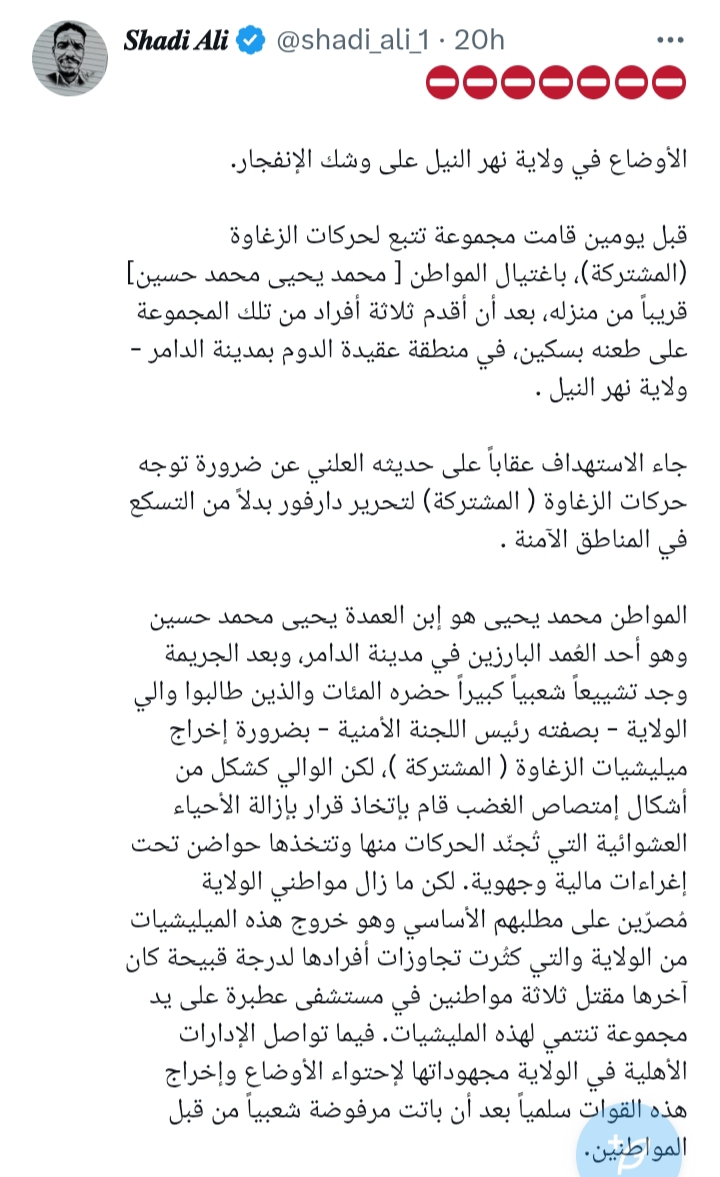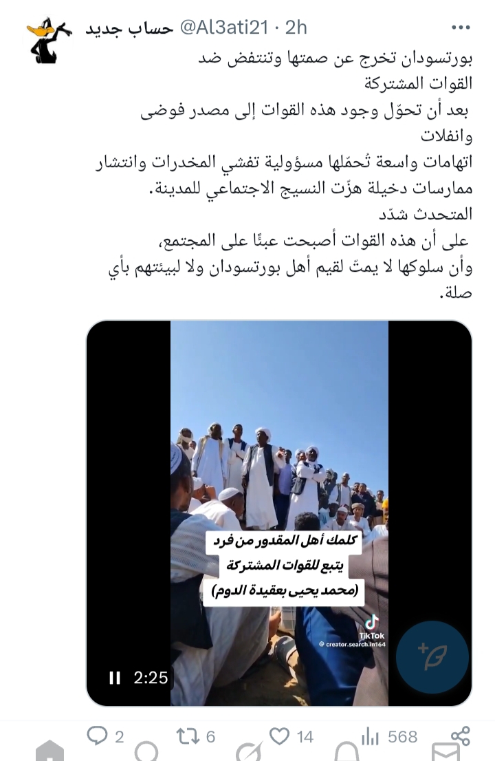 عشان تعرف ايضا ياحيدر البلابصة عنصريين وكلا .ب وبتوع غرض داخل المنبر وخارجه مافي واحد عايز يعترض بشكل وااضح وصرريح حتي منصة اكس وغيرها يعني انتهاكات كيكل لمن كان كان دعامي يشوفوا وانتهاكات المشتركة التي طالت الاعراض والنساء اكثر من عشرين حالة في نهر النيل ما يشوفوا!!!!! وبعد دا يجيك واحد وقول ليك جيشون واحد وشعبون واحد المشكلة المواطن في الشمالية ما بقدر يحارب ناس المشتركة نسبة لوجود فارق التدريب العسكري انتظروا وحتشوفوا مصائب اكتر.