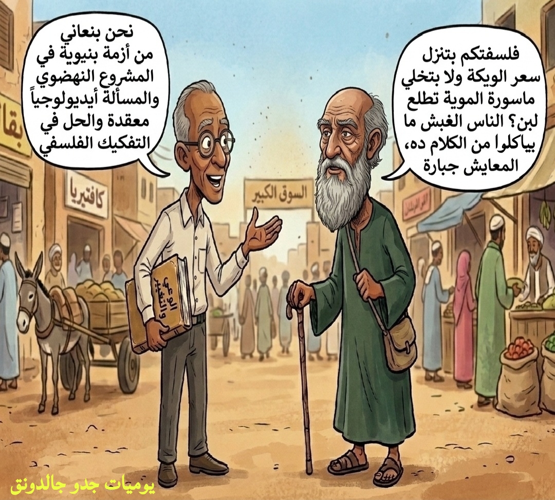 شايف يا ولدي، المثقفين ديل لما يتزنقوا بيضحكوا علينا، يقولوا ليك: 'يا عمنا، المسألة أيديولوجيا معقدة، والحل في التفكيك الفلسفي يا سلام على التفكيك! فلسفتكم دي بتنزل سعر الويكة في السوق؟ ولا بتخلي 'ماسورة الموية' تطلع لبن؟
