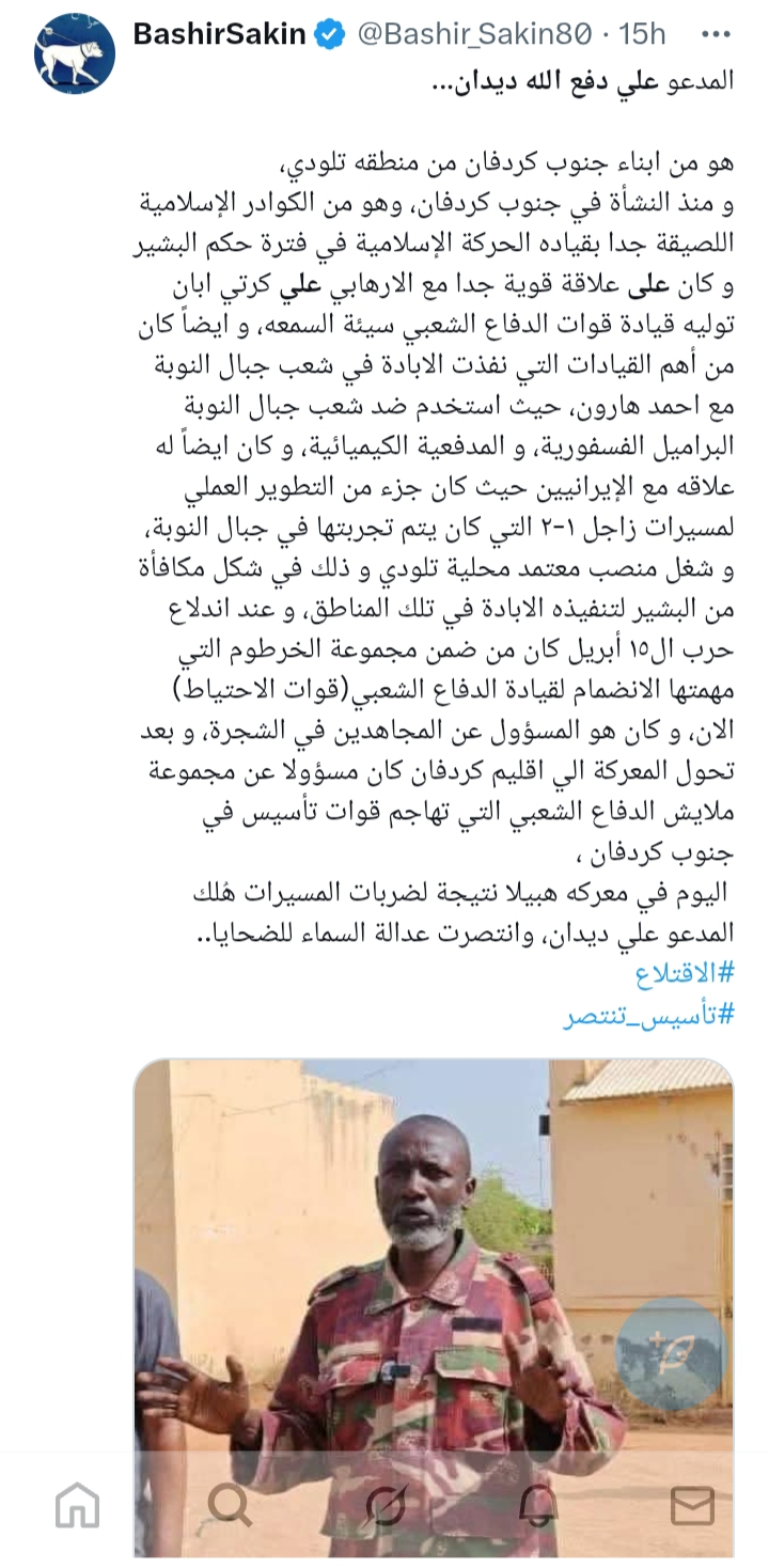 هلك اليوم بمعارك هبيلة أحد اسوأ ارهابيو الحركة الإسلامية القائد السابق بمليشبات الدفاع الشعبي سيئة السمعة، و معتمد محلية تلودي الأسبق علي دفع الله علي ديدان.
