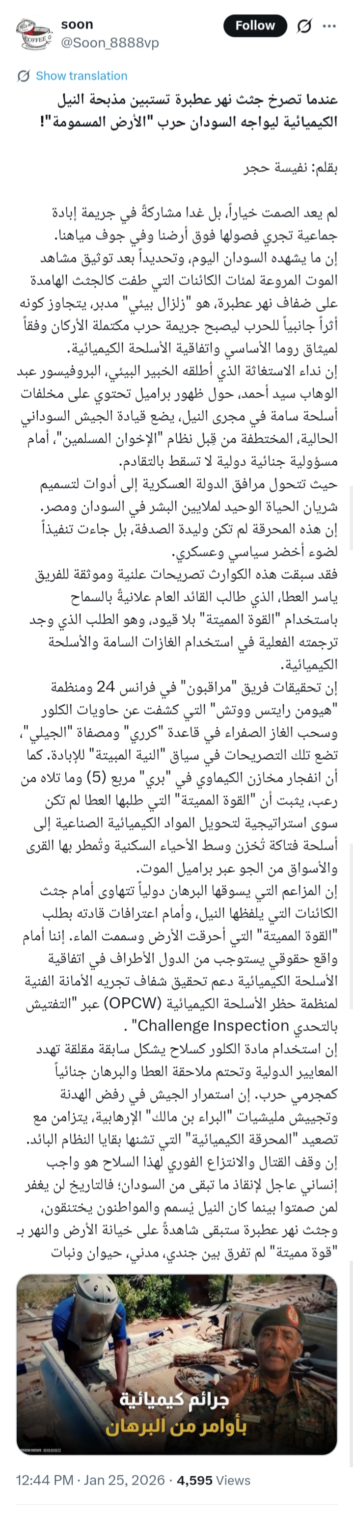 ول أبا عارف، الموضوع بدأ فى كسلا .. وهناك حتى يطمئنوا المواطن، شالوا لهم فئران نصيحة وقتلوها ودخلوها المعمل وطلّعوا أن الفئران ماتت موت طبيعى. ثم أنتقل الحدث إلى نهر عطبرة .. وهو رافد للنيل فى ولاية نهر النيل، يعنى أنتقل السبب إلى النيل.
