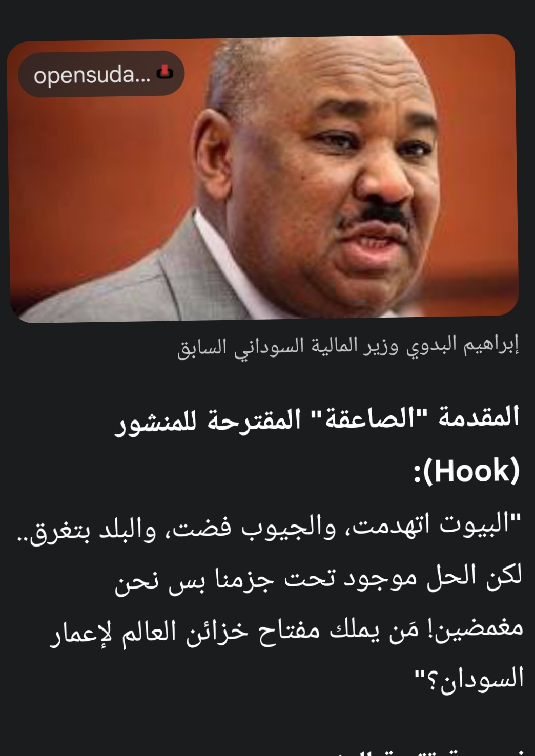 ماعرفت اراسل د البدوي كيف هو متواجد في منصة x وقروب الاقتصاديين السودانيين المهم لو في زول بعرف مكانو وين يرسل له الرابط الخطوات المقبلة ان يكتب هو عن رؤيته للحل باعتباره تكنوقراط ويتخلي عن حزب الامة لان المرحلة القادمة تحتاج تحلل من مل ايدولوجيا الا من أتي للشعب بقلب سليم وبرنامج إعمار وخدمات للناس دون وصايا... اذا حدث ماهو مطلوب سيكون مسنودا بالرباعية والاتحادين الاوروبي والافريقي وكذلك الامم المتحدة ومراكز المال والنفوذ ومن الداخل سيجد السند القوي من قبيلة المعلمين اكبر قبيلة مهنية من حيث العدد والضرر من الحرب وعندما يسند نفسه داخليا وخارجيا تبدأ عجلة النهضة في الدوران حتي الجيش سيجد تأهيل لم يحدث في تاريخ السودان