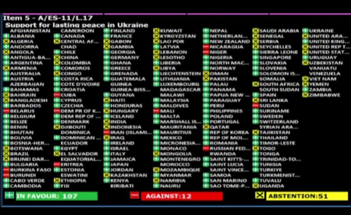 من المفارقات ان الدول الافريقية الصوتت ضد القرار كلهم حكومات انقلابية معلقة عضويتهم في الاتحاد الإفريقي كالسودان والنيجر وبوركينا فاسو ومالي . يساندون روسيا لأنها تدعم الديكتاتوريات العسكرية .