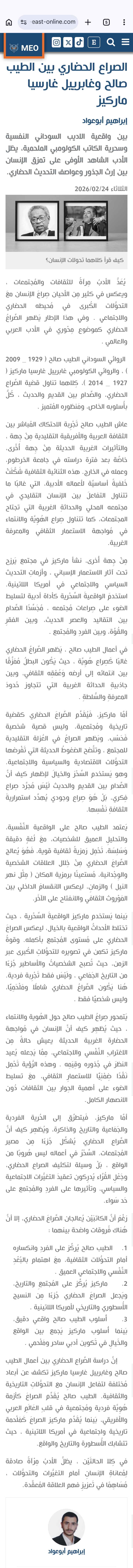 قراءة الكاتب ابراهيم عواد هذه واحدة من احدث المقارنات (غير المتشابهات) بين الطيب صالح وغابرييل غارسيا ماركيز. وهي مقارنات شائعة في النقد الأدبي، وغالباً ما يركز النقاد على تقنيات "الواقعية السحرية"، تصوير المجتمعات المحلية، والإرث الاستعماري. يسلط صراع الحضارات بين الطيب صالح في (موسم الهجرة إلى الشمال) وماركيز في (مائة عام من العزلة) الضوء على مناهج متباينة لما بعد الاستعمار في تناول اللقاء بين العالمين الغربي وغير الغربي. فبينما يستكشف الطيب صالح هذا الصراع من خلال صدام ثنائي مباشر، وعنيف غالباً، بين الشمال (أوروبا) والجنوب (السودان)، يتناوله غارسيا ماركيز من خلال عدسة الواقعية السحرية، مصوراً الاستيعاب السحري والعبثي والمتكرر للتأثير الأجنبي داخل الواقع اللاتيني. تكمن عبقرية الكاتبين في استكشاف أبعاد الهوية، الاستعمار، والعلاقة الجدلية بين "الذات" و"الآخر" في أعمالهما الروائية موضوع المقارنة.