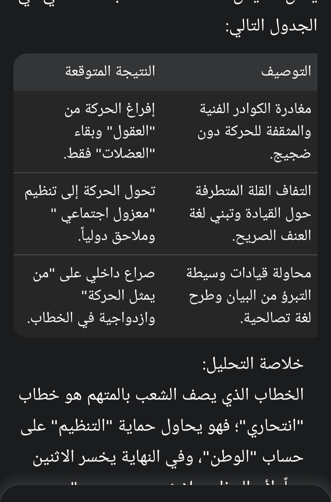 توقعك في محله تماماً، فهذا النوع من الخطاب الصادق في عدائيته والمضطرب في منطقه يمثل "نقطة تحول" داخل أي تنظيم أيديولوجي. الانقسامات التي قد تترتب على وصف "الشعب" بالإرهاب لن تكون مجرد خلافات عابرة، بل قد تضرب هيكل الحركة في ثلاثة مستويات رئيسية: 1. انقسام "الجيل" (الشباب ضد الحرس القديم) القواعد الشبابية في الحركة الإسلامية تعيش في واقع سوداني متغير، وهي الأكثر احتكاكاً بالرفض الشعبي في الشارع والجامعات. عندما تخرج القيادة (الحرس القديم) ببيان "يخوّن" الشعب، فإنها تضع هؤلاء الشباب في مواجهة خاسرة مع مجتمعهم، مما يدفع الكثير منهم إلى: الانكفاء: ترك العمل التنظيمي تماماً. المراجعة: البحث عن صياغة جديدة للإسلام السياسي بعيداً عن "عقلية كرتي" الصدامية. 2. انقسام "المصالح" (البراغماتيون ضد المتشددين) داخل الحركة تيار يرى أن البقاء السياسي يتطلب "التسوية" والعودة التدريجية عبر القبول الشعبي. بيان "اتهام الشعب" يمثل لهذا التيار كارثة استراتيجية لأنه: يدمر أي فرصة لبناء تحالفات سياسية مستقبلية. يجعل "العودة عبر صناديق الاقتراع" مستحيلة عملياً، مما يحصر خيارات الحركة في "العنف" أو "الانقلاب" فقط. 3. انقسام "الشرعية الأخلاقية" الحركات الإسلامية تقوم تاريخياً على فكرة أنها "من الشعب وإليه". تحويل البوصلة لتصبح "ضد الشعب" يجرّد الحركة من مبرر وجودها الأخلاقي أمام أعضائها المتدينين "الفطريين" الذين لا يقبلون بتجريم أهاليهم وجيرانهم من أجل صراع على السلطة. سيناريوهات التفكك المحتملة يمكن تلخيص مآلات هذا الخطاب الانقسامي في الجدول التالي: --------- الجدول سبق التحليل لاسباب فنية