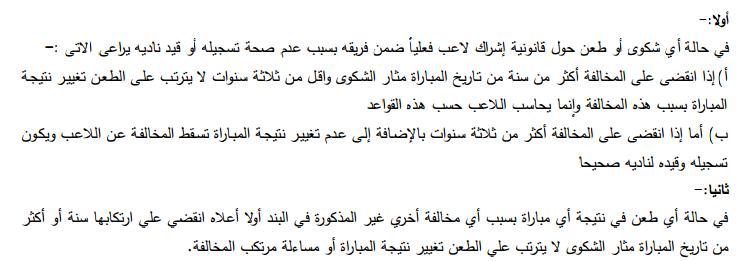 أولا:- ففي حالة أي شكوى أو طعن حول قانونية إشراك لاعب فعلياً ضمن فريق بسبب عدم صحة تسجيله أو قيد ناديه يراعى الآتى :- أ) إذا انقضى على المخالفة أكثر من سنة من تـاريخ المبـاراة مثـار الشـكوى واقـل مـن ثلاثـة سـنوات لا يترتـب علـى الطعـن تغييـر نتيجـة المباراة بسبب هذه المخالفة إنما يحاسب اللاعب حسب هذه القواعد.