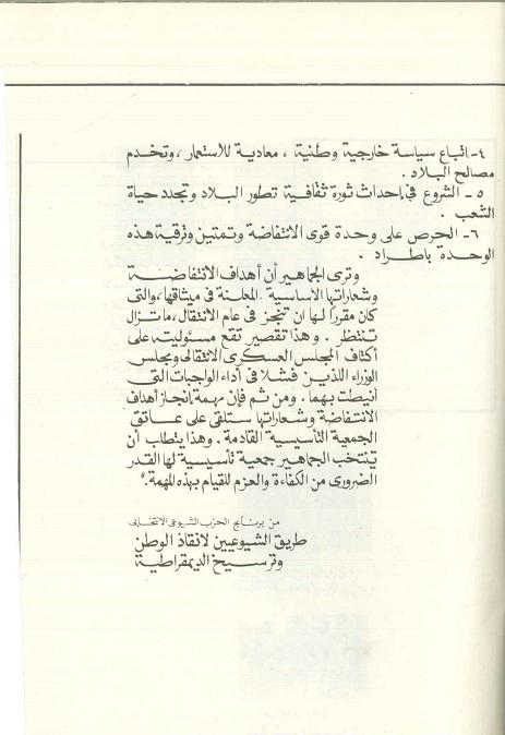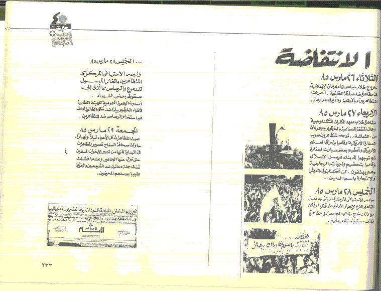 Quote: مخطط أعداء الانتفاضة كان محددا و فعالا و تلخص فى تجريد الجماهير من أسلحتها الاساسية ثم تفكيك وحدتها و تماسكها ليسهل ضرب اليسار والقوة الحديثة، |