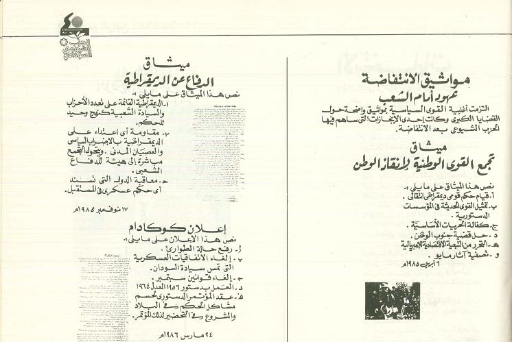 لم يجلس الناس في مؤتمر شعبي عام ليقرروا أن ينتفضوا فقد كان الوضع مستفزا للحد الذي جعلهم يلتقون في الشارع ويتضامنوا لمواجهـة نظام مايو .. وقد تواصلت المواجهة حتى أنكسر النظام .. وللأسف لم تتم مناقشة المسائــــل المتراكمة في الوقت المناسب ليصبح جوهــــر الحوار هو تغيير النظام بشكل توافقي لم يمس جذور الأزمة .. ليجد الناس أنفسهم بعد حين وقد أصبحوا مجموعات متصارعة من جديد وليدفـع الوطن ثمنها عقود عجاف من تاريخه السياسي