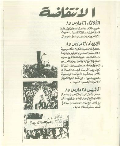 قراءة التاريخ في تلك الفترة كان بلا شك يقود للانتفاضة, الوضع العام كان قاسيا, هناك قوانين مقيدة للحريات, تكميم للافواه, غلاء المعيشة, المجاعة التي غطت اجزاء كثيرة من الوطن, بجانب الفساد الذي عم اجهزة الدولة وكانت الرأسمالية الطفيلية تمتص قوت الشعب, ثم اتى الحدث الذي تمثل في اغتيال الفكر وهو اغتيال المفكر الإسلامي الأستاذ محمود محمد طه, وقد اوضح تماما الافلاس الفكري للنظام والقسوة, بغض النظر عن اتجاهات الناس الفكرية والسياسية, اتفق الجميع على رفض اغتيال الشيخ محمود ونحن نعلم تماما ان السبب الأساسي وراء ذلك هو معارضته للنظام.ثم كانت الشرارة التي اشعلت الشارع زيادة اسعار الخبز, وعلى الرغم من تراجع الدولة عن هذا القرار تواصلت التظاهرات, خرج الشعب السوداني بمختلف فصائله رافضانظام مايو, رغما عن ذلك اذكر ان نميري في اخر حديث له قبل خروجه من السودان وكانت هناك ازمة مياه قال"لو الماسورة صفرت انا ما بتنازل عن الحكم !!." |